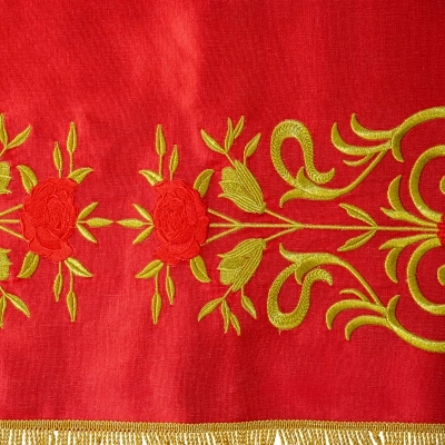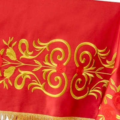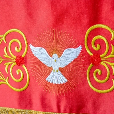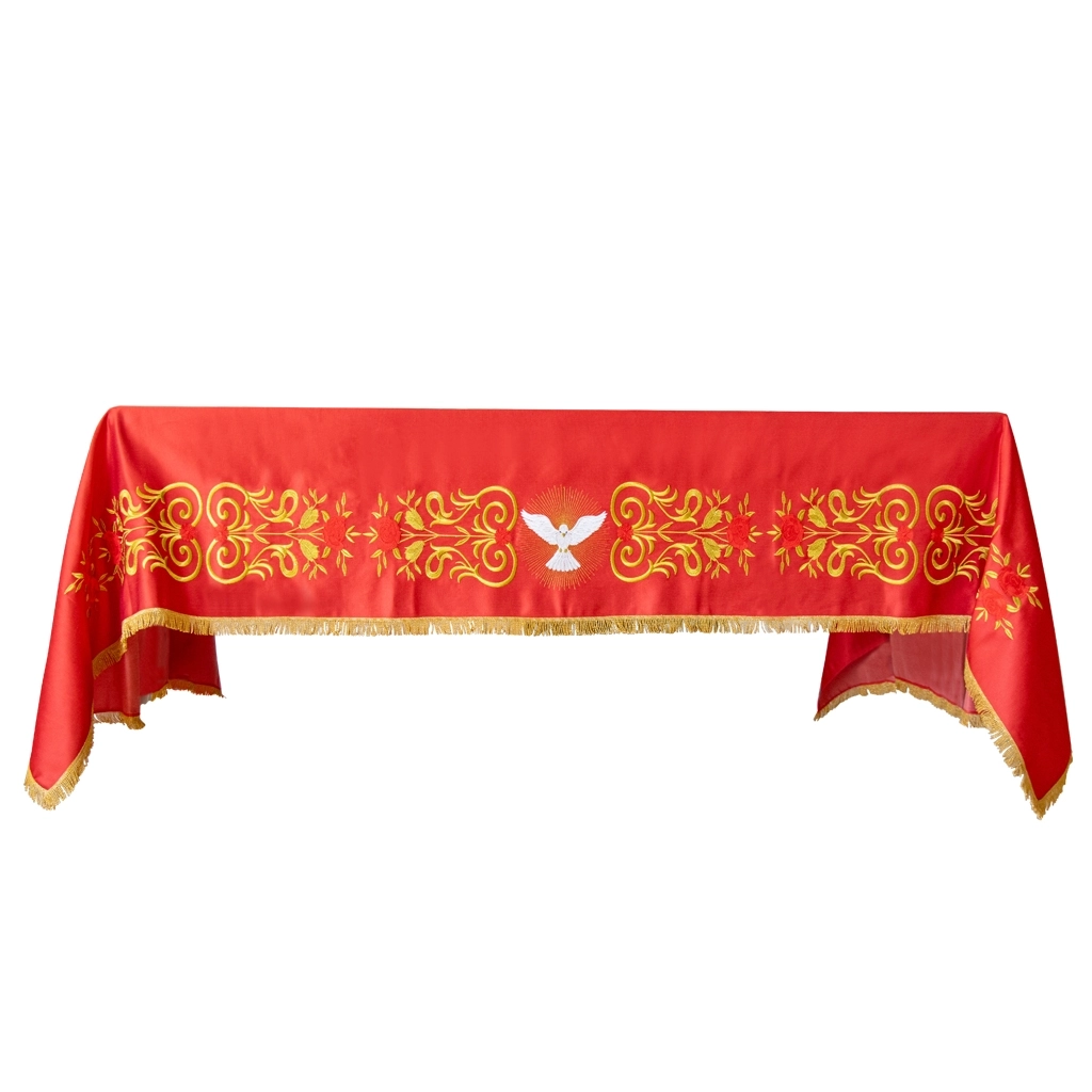 Meravigliosa tovaglia da altare rossa in raso di cotone, con ricamo in filo oro e colomba dello Spirito Santo in filo bianco. Il ricamo è presente nella parte frontale della tovaglia. Il bordo presenta frange dorate. Le dimensioni totali sono 150x250 cm.