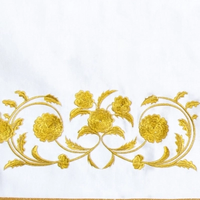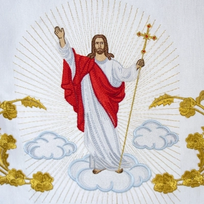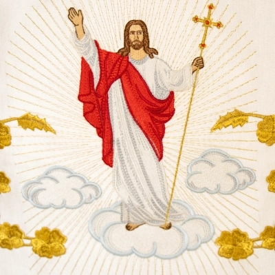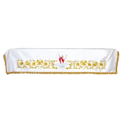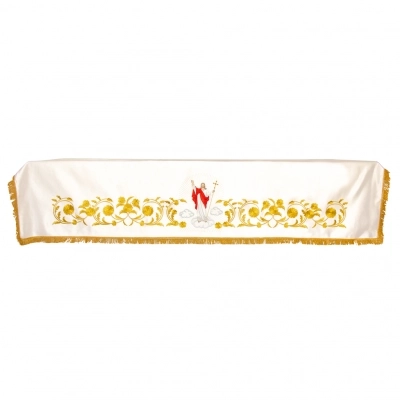 Meravigliosa tovaglia da altare bianca in raso di cotone, con ricamo di Gesù Risorto . Il ricamo è presente nella parte frontale della tovaglia. Il bordo presenta frange dorate. Le dimensioni totali sono 100x160 cm. Da usare per decorare l'altare durante le celebrazioni di Pasqua.
