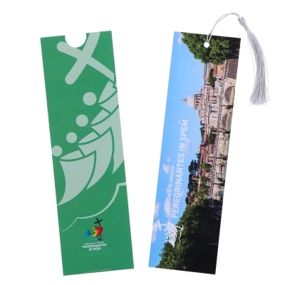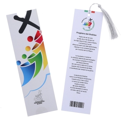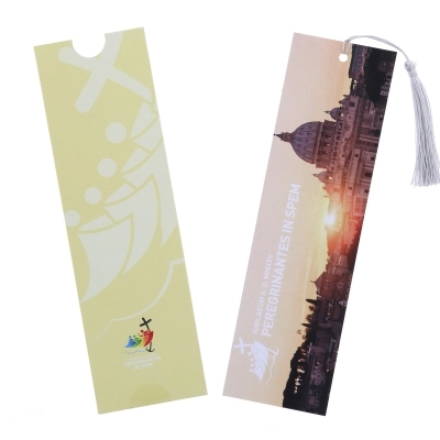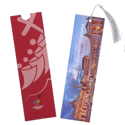 Segnalibro in carta con nappina in stoffa e bellissime immagini della cattedrale di san Pietro da un lato e dall'altro il logo ufficiale del Giubileo 2025 "Pellegrini di Speranza". Ogni segnalibro viene fornito con una custodia, il cui colore determina la grafica interna del segnalibro. Idea regalo originale ed economica per festeggiare al meglio questo anno così importante. Realizzato in Italia.