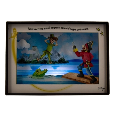 Originale quadro tridimensionale in scatola, con soggetto Peter Pan e bellissima frase emozionale e motivazionale. Il quadro si presenta come una semplice ed elegante scatola, ma quando si toglie il coperchio si scopre che in realtà è un bellissimo quadretto, particolare per la sua tridimensionalità, infatti è sviluppato su tre livelli: un livello in cui è illustrato lo sfondo e altri due livelli per i personaggi. Funge anche da lampada da compagnia, in quanto è dotato di una lucina che funziona con le batterie e con un pulsante di accensione e spegnimento. Ideale da regalare in occasione di una Nascita, Prima Comunione o per qualsiasi altro evento o come arredo per la cameretta.