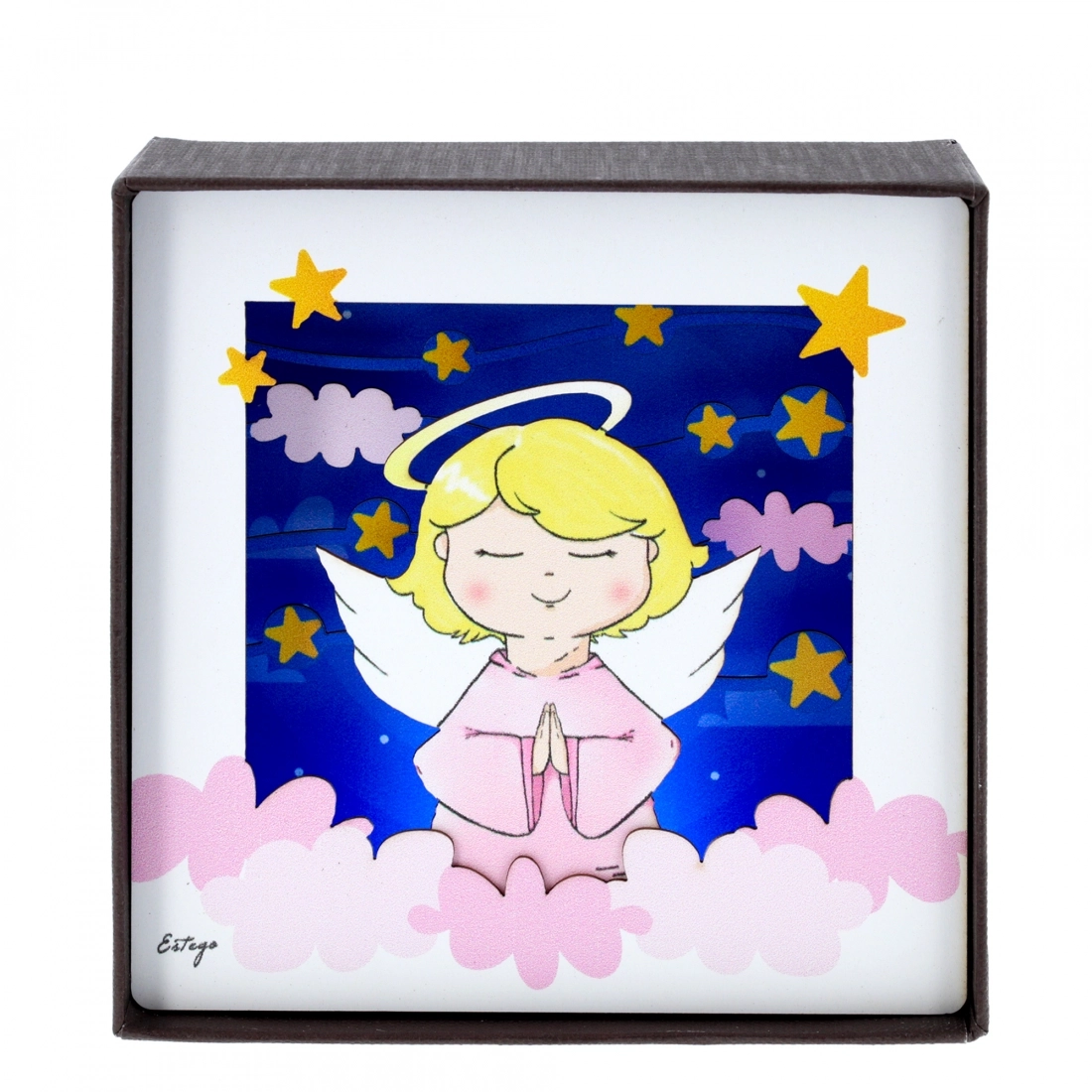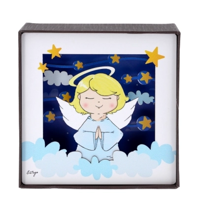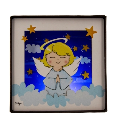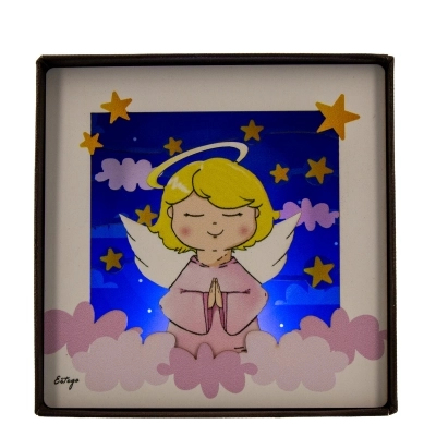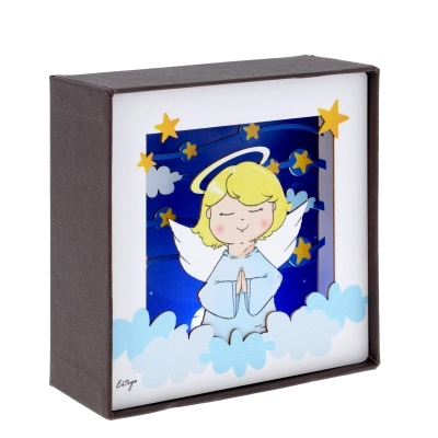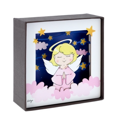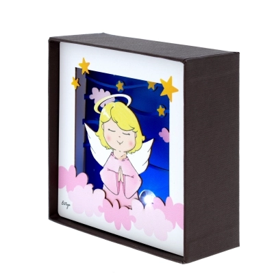Originale quadro tridimensionale in scatola, con soggetto Angelo, disponibile nelle versioni rosa e celeste. Il quadro si presenta come una semplice ed elegante scatola, ma quando si toglie il coperchio si scopre che in realtà è un bellissimo quadretto, particolare per la sua tridimensionalità, infatti è sviluppato su tre livelli: un livello in cui è illustrato lo sfondo e altri due livelli per i personaggi. Funge anche da lampada da compagnia, in quanto è dotato di una lucina che funziona con le batterie e con un pulsante di accensione e spegnimento. Ideale da regalare in occasione di una Nascita o per qualsiasi altro evento o come arredo per la cameretta.