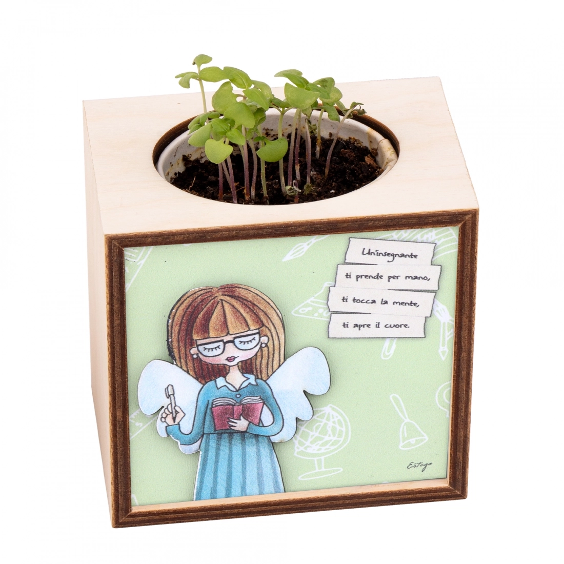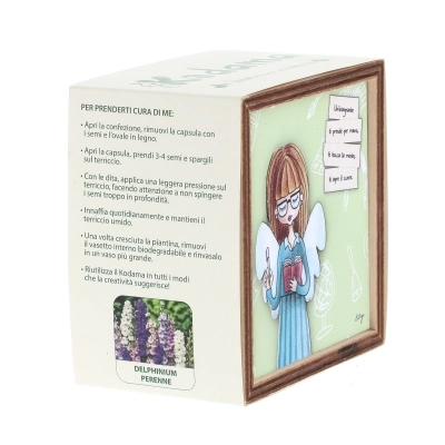 Kodama è un cubo di legno decorato che contiene un vasetto biodegradabile con all’interno del terriccio e dei semi di piante aromatiche e fiori pronti per essere piantati. Perfetto come regalo, è fatto in legno di betulla che, con le sue leggere venature, dona unicità al prodotto.