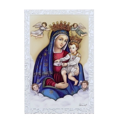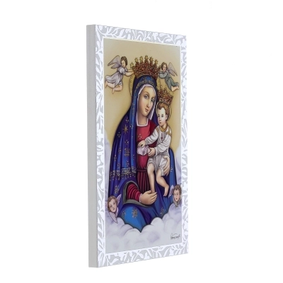 Quadro in legno della Madonna delle Grazie, con eleganti dettagli in foglia argento lungo i bordi che lo arricchiscono e lo rendono un oggetto di pregio.