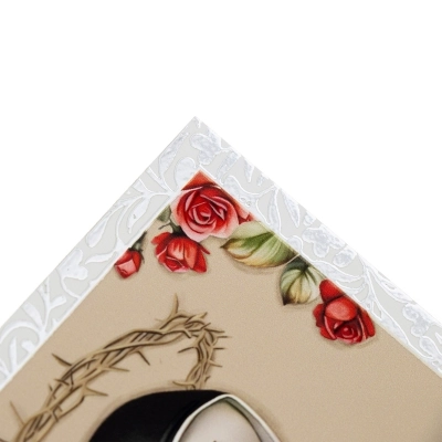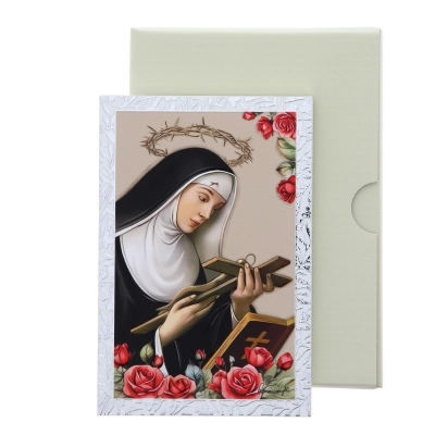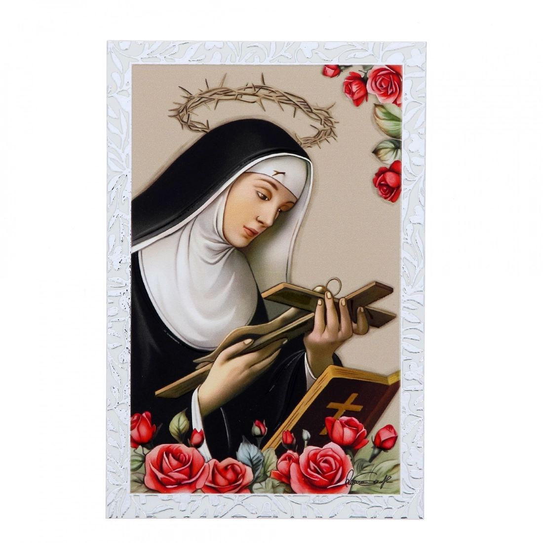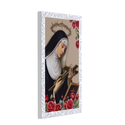 Quadro in legno, con eleganti dettagli in foglia argento lungo i bordi che lo arricchiscono e lo rendono un oggetto di pregio. Il quadro rappresenta Santa Rita da Cascia che è stata una religiosa italiana del monastero eremitano di Santa Maria Maddalena. Al culto di santa Rita è legato il sacramentale delle rose benedette. Tale devozione è ispirata alla leggenda del roseto del giardino dei suoi genitori fatto miracolosamente fiorire dalla santa d'inverno, mentre era malata in monastero. Il rito, celebrato il 22 maggio, consiste nella benedizione da parte del sacerdote delle rose presentate dai devoti, i quali portano i fiori benedetti a casa come segno del patrocinio della santa.