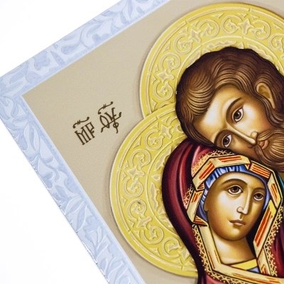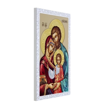 Quadro in legno, con eleganti dettagli in foglia argento lungo i bordi e decorazioni in foglia oro che lo arricchiscono e lo rendono un oggetto di pregio. Viene rappresentata la Sacra Famiglia: Gesù, Maria e Giuseppe insieme, secondo la tradizione dell’iconografia bizantina, in stile artigianale dipinto a mano. Questa icona è opera d'arte sacra che simboleggia la famiglia cristiana e i valori spirituali ad essa associati.