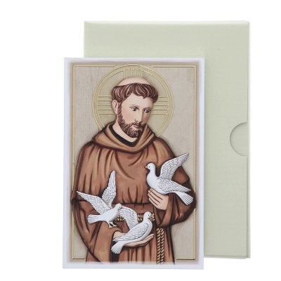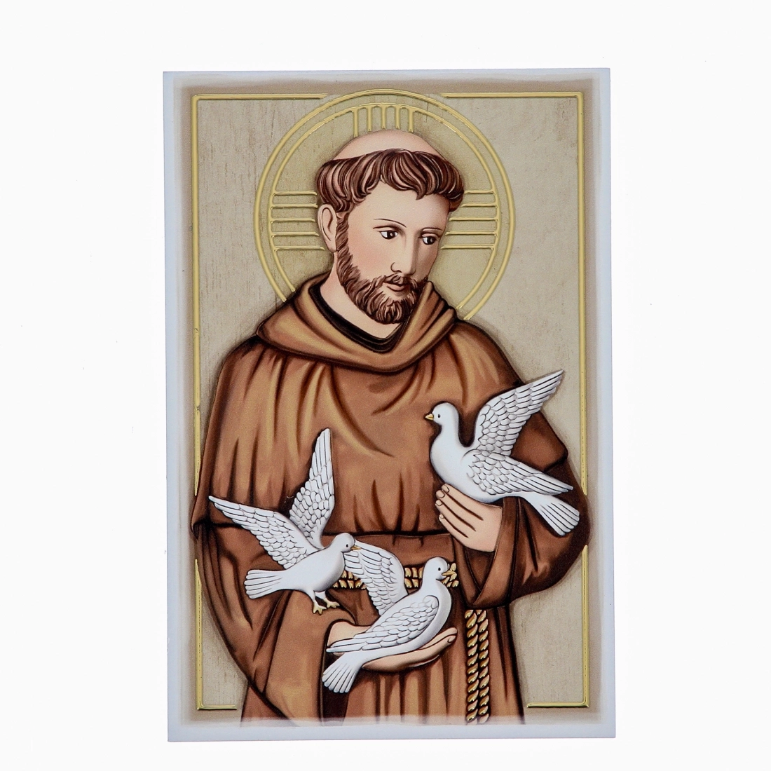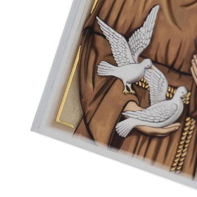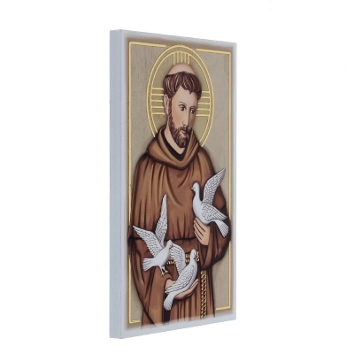 Quadro in legno, con eleganti dettagli in foglia oro che lo arricchiscono e lo rendono un oggetto di pregio. Viene raffigurato San Francesco d'Assisi: religioso, mistico e poeta italiano, fondatore dell’Ordine dei Frati Minori e patrono d’Italia. E' un oggetto d'arte sacra che unisce valore religioso, estetico e decorativo,