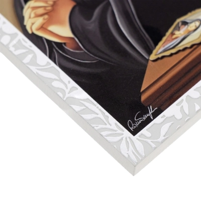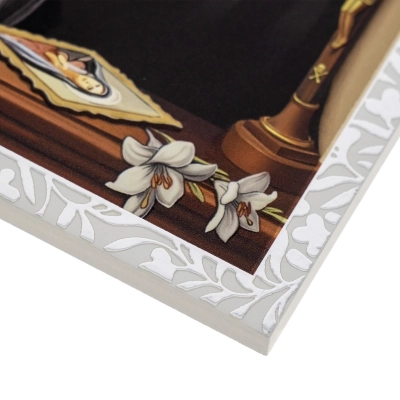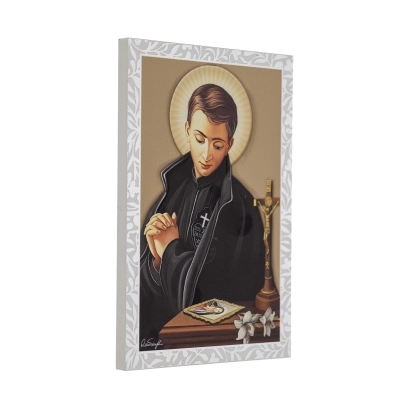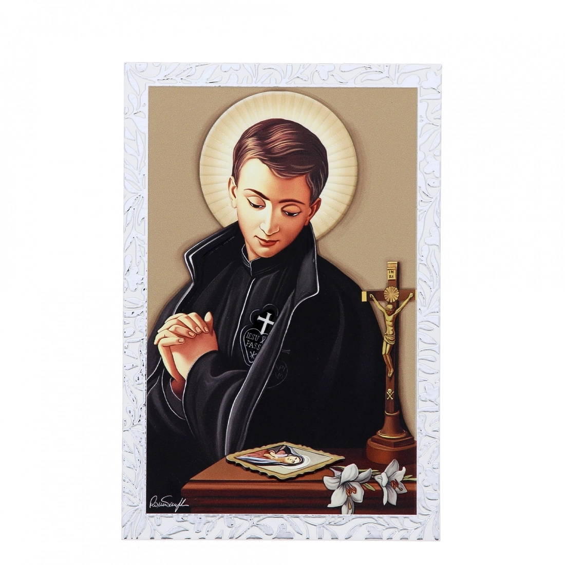 Quadro in legno, con eleganti dettagli in foglia argento lungo i bordi che lo arricchiscono e lo rendono un oggetto di pregio. Il quadro di San Gabriele dell'Addolorata è una rappresentazione artistica del santo passionista Francesco Possenti, noto come San Gabriele dell'Addolorata, vissuto nel XIX secolo e canonizzato nel 1920. San Gabriele dell'Addolorata è ricordato come modello di santità accessibile e contemporanea, patrono dei giovani e degli studenti, simbolo di fede, gioia e speranza, con un culto diffuso tra la gioventù cattolica italiana.