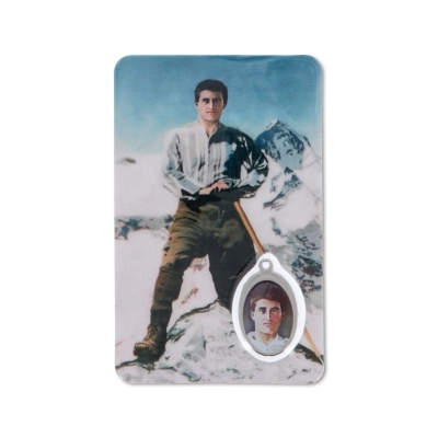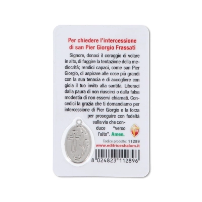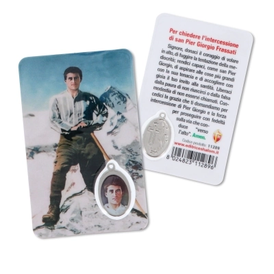 Card plastificata da collezione, delle dimensioni di 5,5 x 8,5 cm, con inserto medaglia dedicata al santo. La card è delle dimensioni di un bancomat, per cui può essere posta ovunque, anche dentro al portafogli, per portare con sè la protezione del santo ovunque si vada. Questa card è dedicata a Pier Giorgio Frassati e sul retro si trova una preghiera in italiano rivolta a lui.