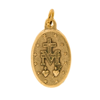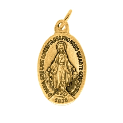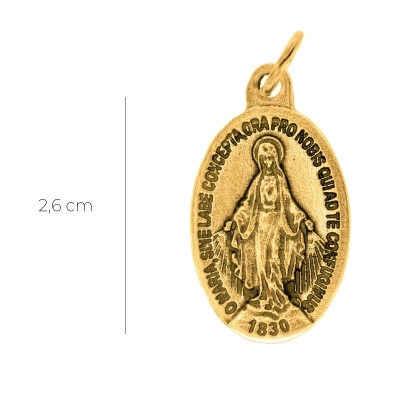 Medaglia Miracolosa in zama dorata, riprodotta come l'originale, così come la Madonna è apparsa alla veggente Santa Caterina de Labourè nel 1830 a Rue de Bac. La scritta nella parte frontale è in lingua latina e riporta la seguente frase "O maria sine labe concepta ora pro nobis qui ad te confugimus". La medaglia è dotata di anellino per poter essere appesa ad una catenina ed indossata al collo (catenina non inclusa).