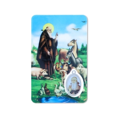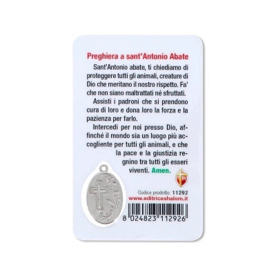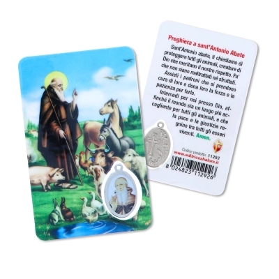 Card plastificata da collezione, delle dimensioni di 5,5 x 8,5 cm, con inserto medaglia dedicata al santo. La card è delle dimensioni di un bancomat, per cui può essere posta ovunque, anche dentro al portafogli, per portare con sè la protezione del santo ovunque si vada. Questa card è dedicata a sant'Antonio Abate e sul retro si trova una preghiera in italiano rivolta a lui.
