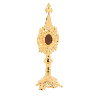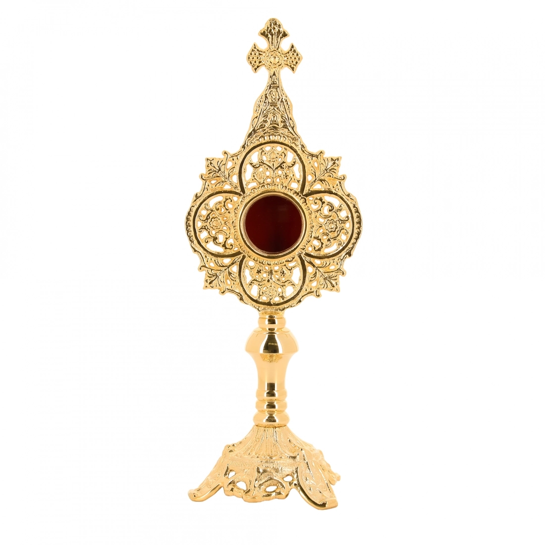 Reliquiario in stile barocco realizzato in ottone dorato e finemente intarsiato, lavorato a mano. La teca centrale tonda, rivestita di vellutino rosso, è sorretta da un fusto con base decorata. La teca è avvolta da una cornice che ricorda un quadrifoglio. Sull'estremità una croce conferisce al reliquiario eleganza e solennità.