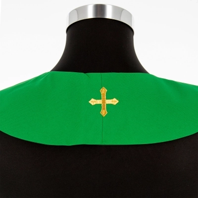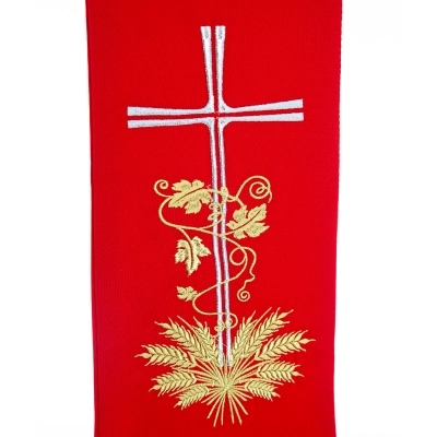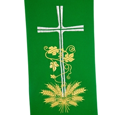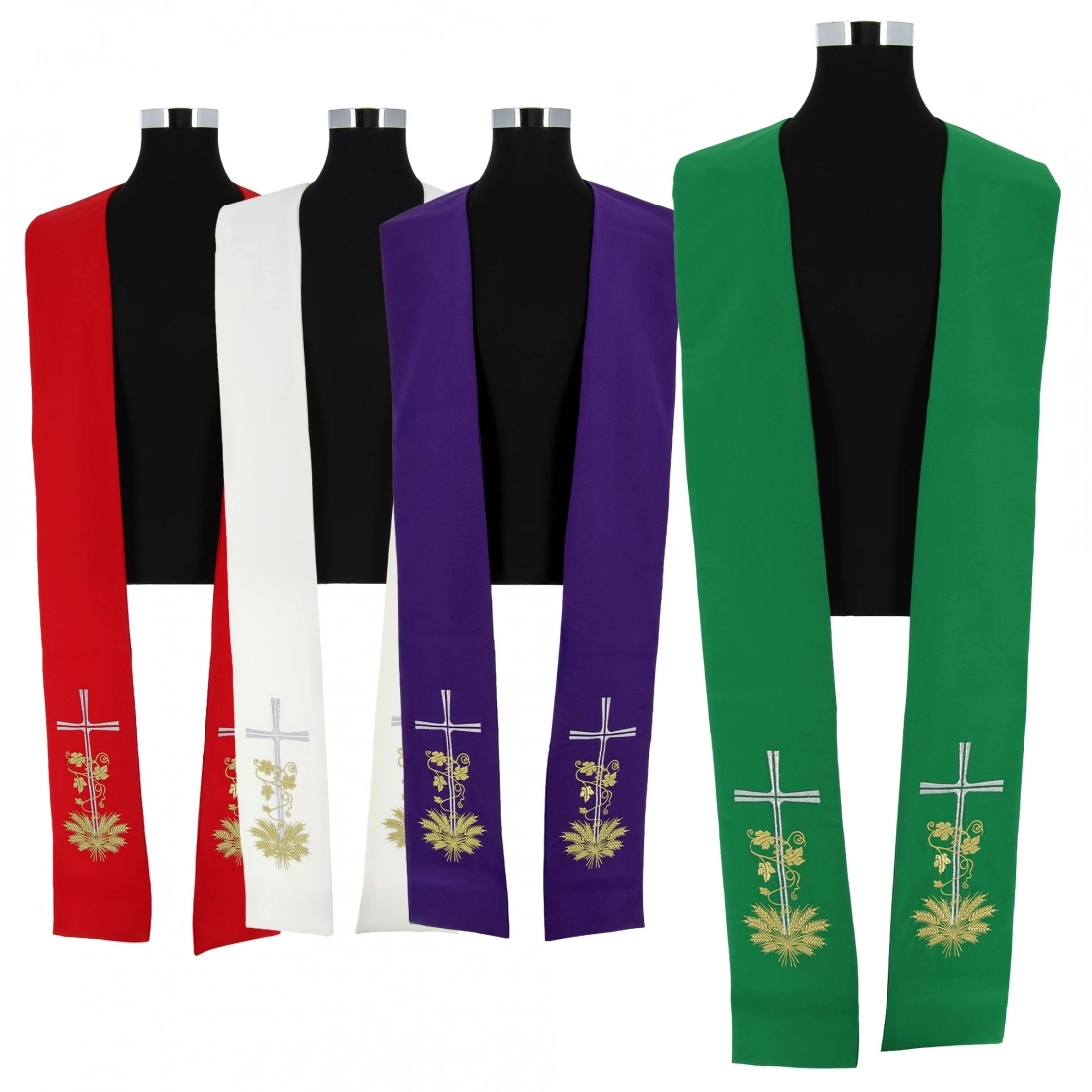 Stola sacerdotale semplice e raffinata, in poliestere, decorata alle estremità con il ricamo di una croce in filo argentato, con delle spighe e la vite in filo dorato. Disponibile nei quattro colori di rito: avorio, verde, viola e rosso. La lunghezza della stola è di 246 cm, ideata per arrivare ben oltre al ginocchio del sacerdote che la indossa.