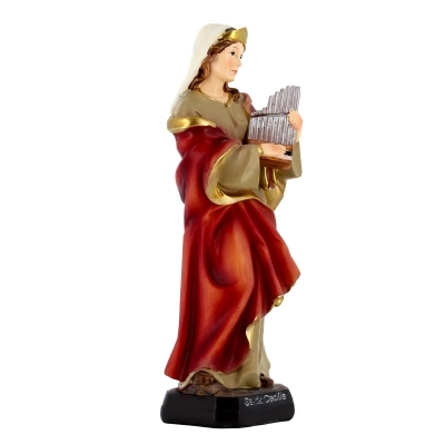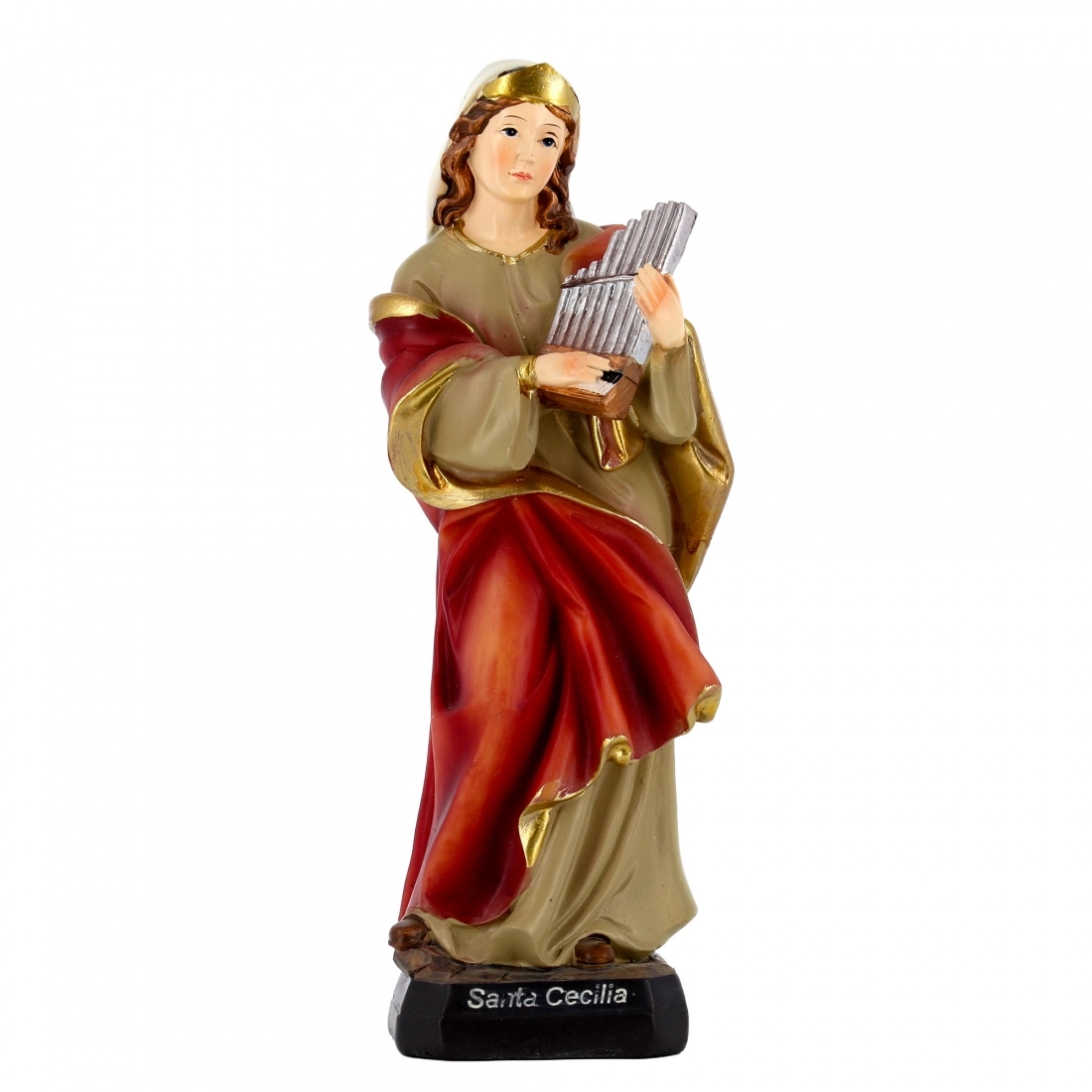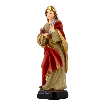 Graziosa e dettagliata statua in resina che raffigura Santa Cecilia. Santa Cecilia è una santa venerata dalla Chiesa cattolica e considerata la patrona dei musicisti. È nota per la sua fedeltà alla fede cristiana e per il suo martirio nel III secolo. Secondo la tradizione, Santa Cecilia era una nobile romana che, nonostante fosse promessa in sposa a un pagano, mantenne la sua verginità consacrata a Dio. Fu imprigionata e martirizzata per la sua fede, ma secondo la leggenda, durante il suo martirio continuò a cantare a Dio. La sua festa viene celebrata il 22 novembre.