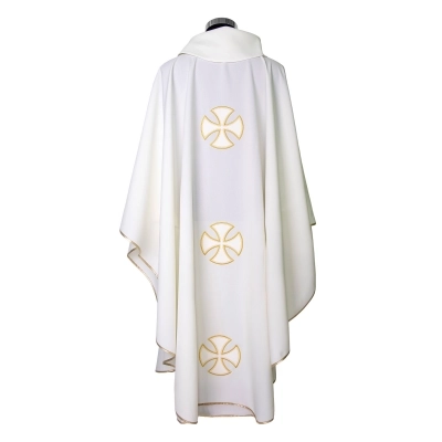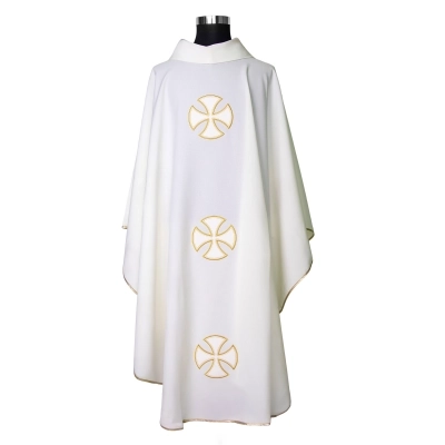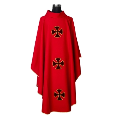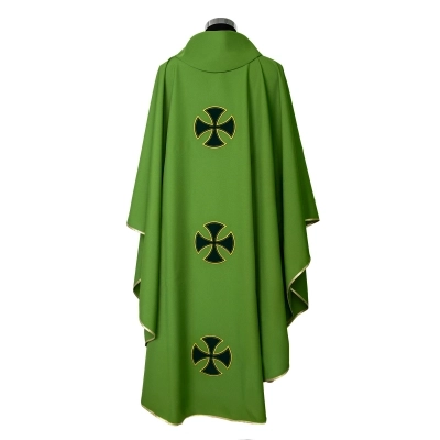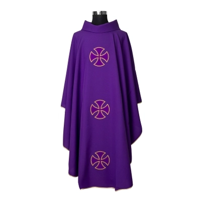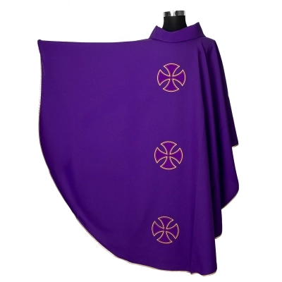 Casula sacerdotale 100% poliestere, presenta sia sul fronte che sul retro 3 croci in velluto, tono su tono con il colore del tessuto della casula, applicate tramite ricamo diretto con filo dorato. Prodotto interamente in Italia, da un'azienda di artigiani esperti che da molti anni opera nel settore dei paramenti sacri, creando prodotti artigianali e di altissima qualità. Disponibile nei 4 colori liturgici.