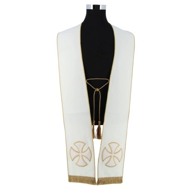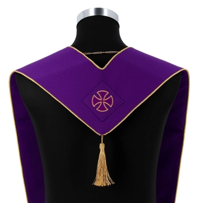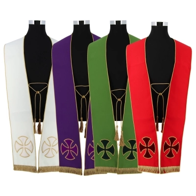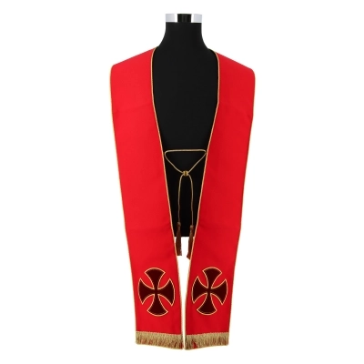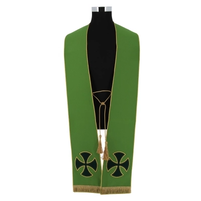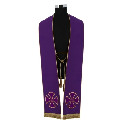 Stola sacerdotale 100% poliestere con croci in velluto, tono su tono con il colore del tessuto della stola, applicate tramite ricamo diretto con filo dorato. Le croce hanno una dimensione di 14x14 cm. La stola è arricchita da frange dorate applicate sui bordi finali. Prodotto interamente in Italia, da un'azienda di artigiani esperti che da molti anni opera nel settore dei paramenti sacri, creando prodotti artigianali e di altissima qualità. Disponibile nei 4 colori liturgici.