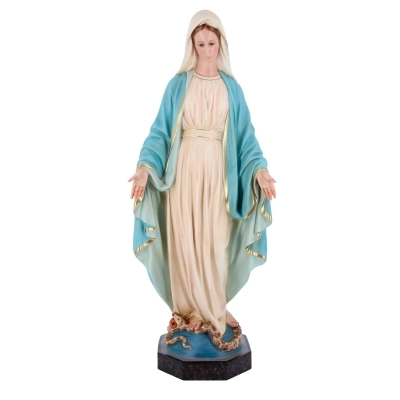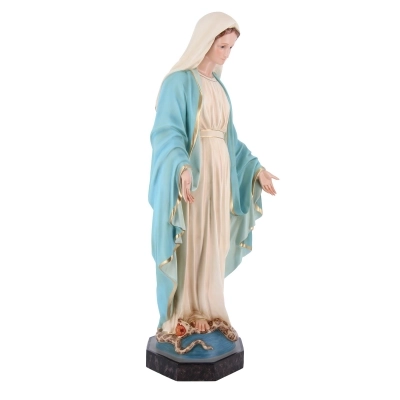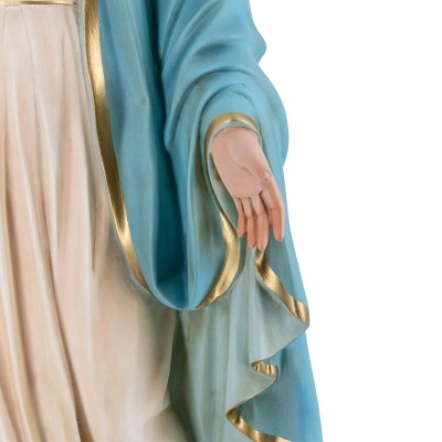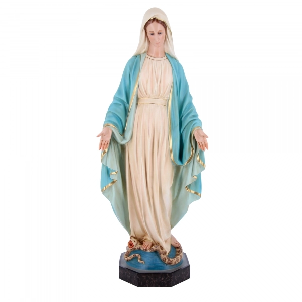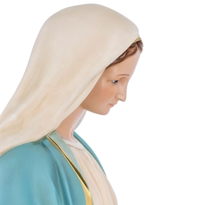 Splendida statua raffigurante la Madonna Immacolata, realizzata in vetroresina di alta qualità e finemente dipinta a mano. Alta 107 cm, questa statua si distingue per l’espressione dolce e serena del volto, resa ancora più realistica dalla presenza di occhi in vetro, che donano profondità allo sguardo e una particolare intensità spirituale.