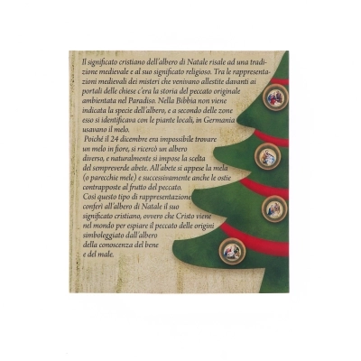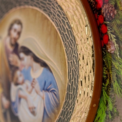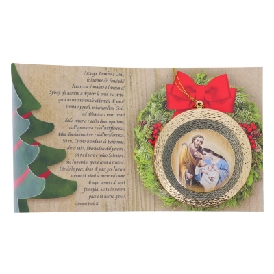 Elegante decorazione natalizia raffigurante la Sacra Famiglia. Il medaglione rotondo presenta un'immagine artistica di San Giuseppe, la Vergine Maria e il Bambin Gesù, simbolo di amore, unione e fede. L'immagine centrale è incorniciata da un bordo decorato in foglia oro e martellato, che dona luce e pregio alla decorazione. Realizzata in materiale resistente con finiture dorate lucide, perfetta per durare negli anni. Dotata di cordoncino dorato per portare un tocco di spiritualità e tradizione all'albero di Natale. Perfetta non solo per decorare la casa durante le festività, ma anche come idea regalo significativa per amici e familiari, essendo dotata di carinissimo packaging in carta con scritta una preghiera a Gesù Bambino di Giovanni Paolo II.