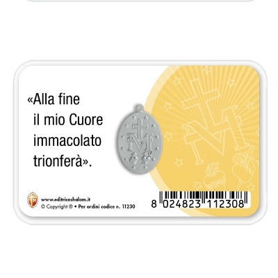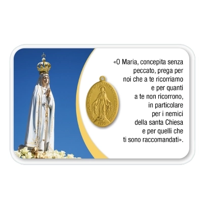 Medaglia Miracolosa realizzata in alluminio color oro, inserita al centro di una card, delle dimensioni di 8,8x5,5 cm. La grafica è moderna e accattivante, molto utile è inoltre la plastificazione che permette alla medaglia e al santino di essere trasportati ovunque, senza il rischio di rovinarsi e stropicciarsi. Questa card è dedicata alla Madonna di Fatima e contiene una bellissima preghiera in italiano.