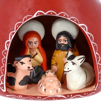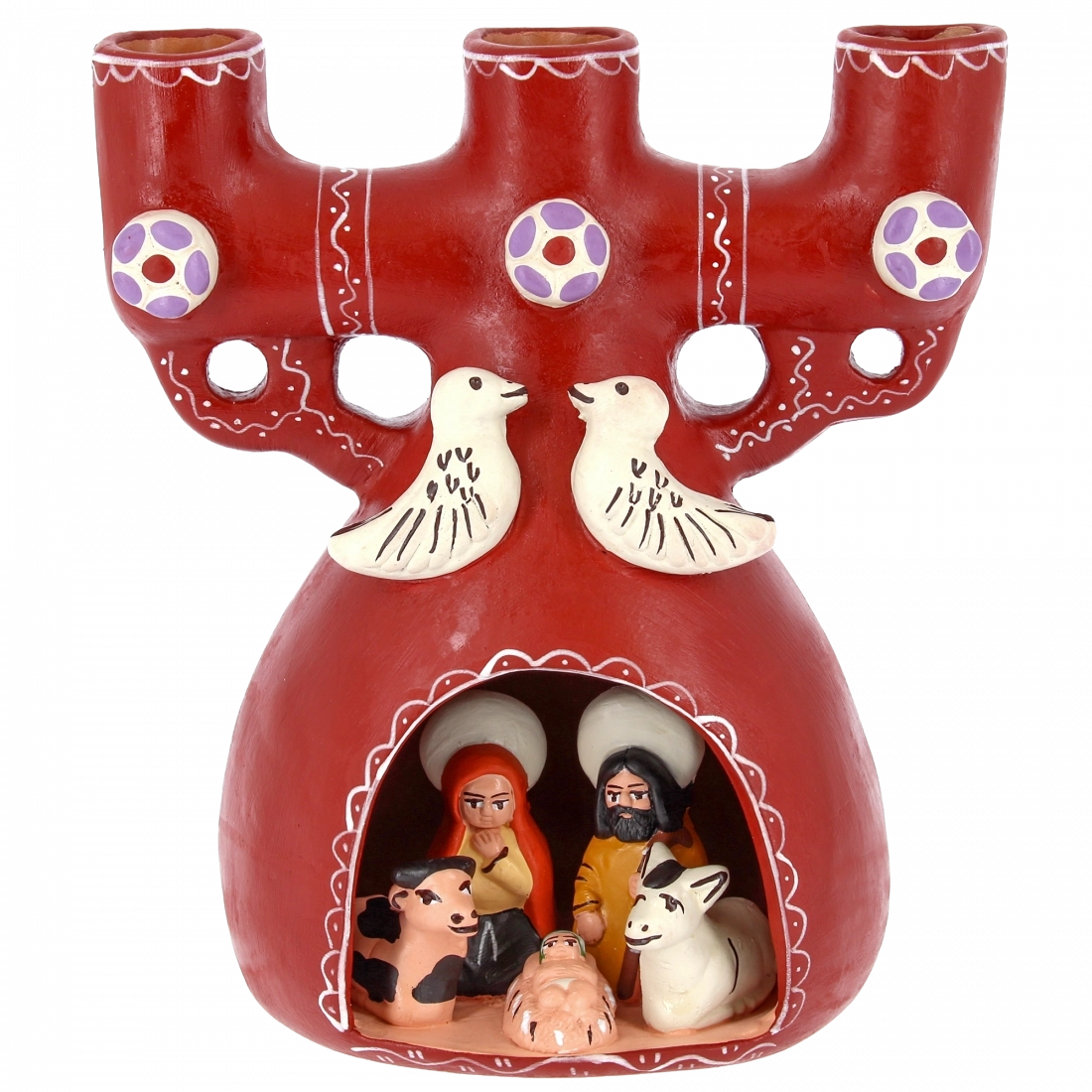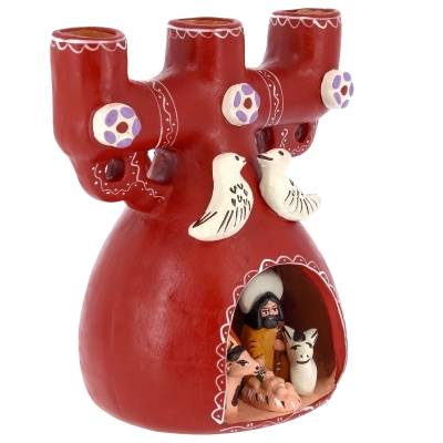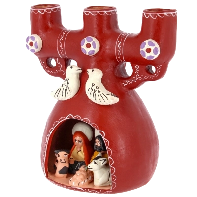 La struttura, in ceramica dipinta a mano, presenta tre alloggi per candele e un presepe in miniatura racchiuso nella parte inferiore. All’interno sono raffigurati Gesù Bambino, Maria e Giuseppe, accompagnati dagli animali del presepe. Nella parte superiore spiccano due colombe stilizzate, simbolo di pace e benedizione, che rendono il pezzo ancora più suggestivo. Questo portacandele etnico non è soltanto un elemento decorativo, ma una piccola opera d’arte che unisce fede, tradizione e artigianato di qualità.