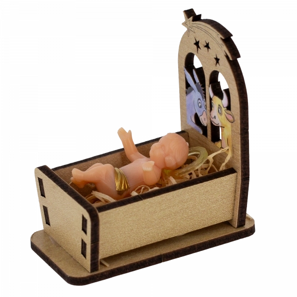 Completa la tua scena della Natività con questa culla/mangiatoia in legno, ideale come accessorio per presepi di ogni stile. La struttura è realizzata con doghe effetto legno e gambe incrociate che garantiscono stabilità e un aspetto rustico e autentico. L’interno è dotato di morbida ovatta bianca, perfetta per accogliere la tua statuina del Bambino Gesù (non inclusa). Questo accessorio si adatta a diverse dimensioni di figure, rendendolo versatile per presepi domestici, chiese e allestimenti natalizi. Le misure interne della culla sono Larghezza 8,5 cm - Profondità 15,5 cm e Altezza 4 cm.