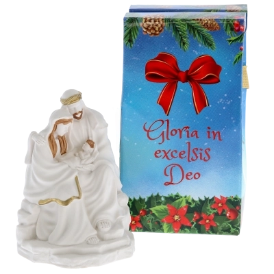 La statuina è accompagnata da una confezione regalo a tema natalizio, decorata con rami di pino, stelle di Natale e la scritta “Gloria in excelsis Deo”, ideale per un dono spirituale elegante e significativo.