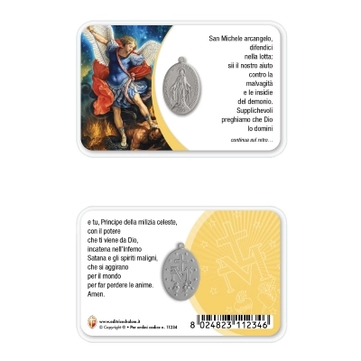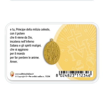 Medaglia Miracolosa realizzata in alluminio color oro, inserita al centro di una card, delle dimensioni di 8,8x5,5 cm. La grafica è moderna e accattivante, molto utile è inoltre la plastificazione che permette alla medaglia e al santino di essere trasportati ovunque, senza il rischio di rovinarsi e stropicciarsi. Questa card è dedicata a san Michele Arcangelo e contiene una preghiera in italiano rivolta a lui.