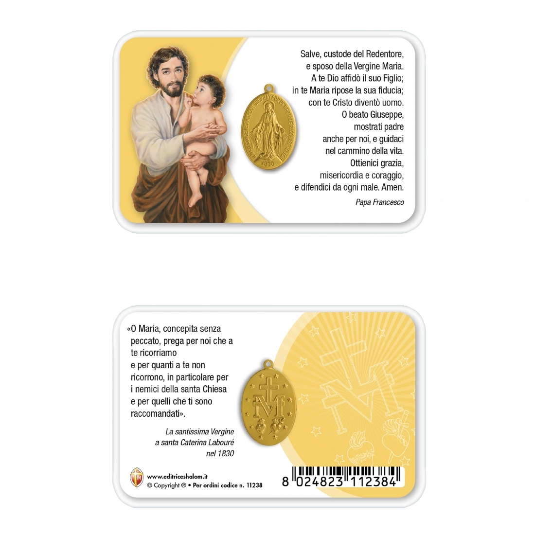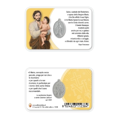 Medaglia Miracolosa realizzata in alluminio color oro, inserita al centro di una card, delle dimensioni di 8,8x5,5 cm. La grafica è moderna e accattivante, molto utile è inoltre la plastificazione che permette alla medaglia e al santino di essere trasportati ovunque, senza il rischio di rovinarsi e stropicciarsi. Questa card è dedicata a san Giuseppe e contiene una preghiera in italiano rivolta a lui.