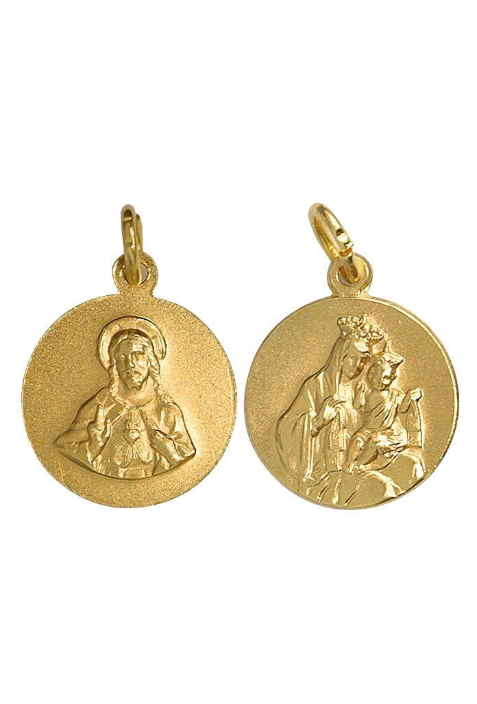 Medaglia in ottone dorato dello Scapolare del Carmelo, dal diametro di 1,8 cm, raffigura su un lato la Madonna del Carmelo e dall'altra il Sacro Cuore di Gesù, proprio le due raffigurazioni che si trovano sullo Scapolare del Carmelo. Il significato dello scapolare è profondo: simboleggia la protezione della Madonna e l'impegno a vivere una vita cristiana. Secondo la tradizione, chi indossa lo scapolare con fede riceve la promessa di protezione e aiuto, non solo in questa vita, ma anche nell'aldilà. Prodotto da regalare per fare apostolato.