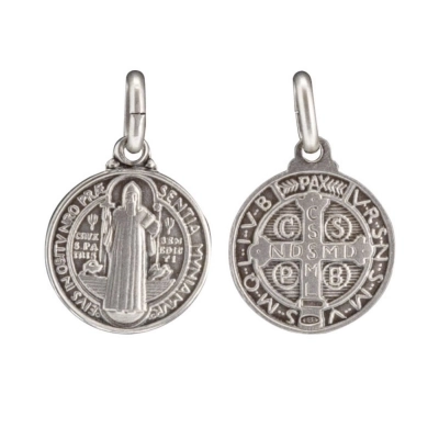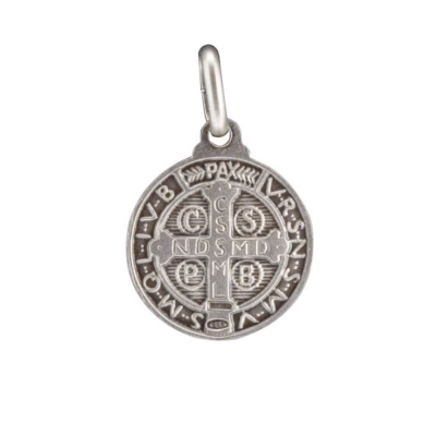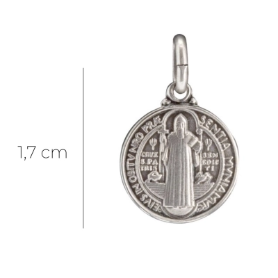 Medaglia in alluminio dal diametro 1,7 cm, raffigurante la medaglia di san Benedetto. La medaglia è dotata di anellino per poter essere appesa ad una catenina ed indossata al collo (catenina non inclusa) oppure da portare sempre con sè per esempio dentro al portamonete. La medaglia è estremamente dettagliata e rifinita con cura. Realizzata in Italia da un'azienda artigianale specializzata nella creazione e produzione di medaglie.