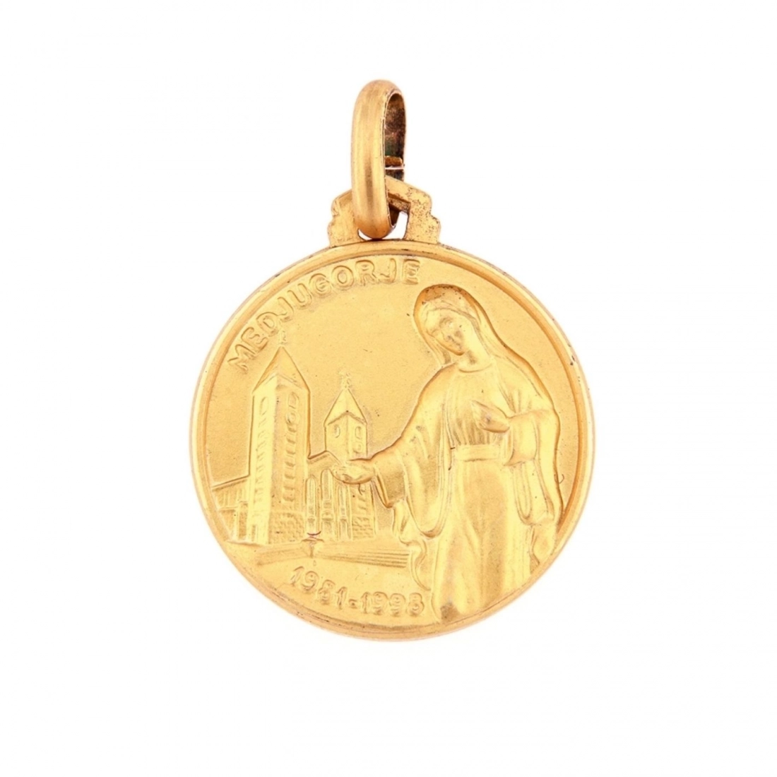 Bellissima medaglia di Medjugorje in argento 925 bagnata oro, dal peso di 3,6 gr. e diametro 1,8 cm, raffigurante la Madonna con affianco la basilica di Medjugorje e sul retro la croce posta sulla cima del Monte Krizevac, dove i pellegrini nel salire ripercorrono tutte le tappe della Via Crucis. La medaglia è dotata di anellino per poter essere appesa ad una catenina ed indossata al collo (catenina non inclusa). La medaglia è estremamente dettagliata e rifinita con cura. Realizzata appositamente per Editrice Shalom, che ne ha seguito direttamente tutta la lavorazione, dalla scultura in plastilina fino alla realizzazione del primo modello. Rigorosamente ideata e prodotto in Italia da un'azienda artigianale e leader nella produzione di medaglie.