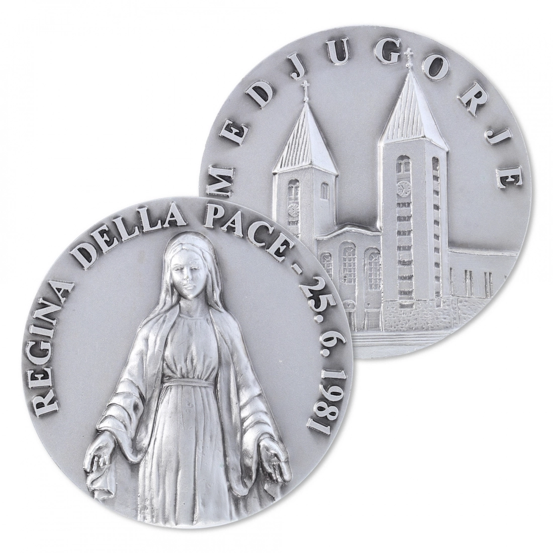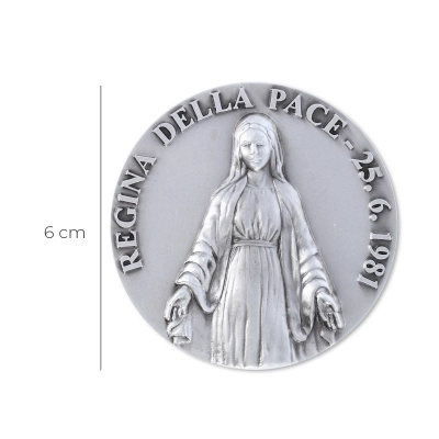 Medaglia grande della Regina della Pace, tonda, in ottone argentato, con scritta "Regina della Pace - 25.06.1981", data che ricorda il giorno della prima apparizione della Vergine Maria a Medjugorje. Grazie alla sua dimensione, è possibile notare quanto siano ben rifiniti tutti i particolari, specialmente del volto della Madonna. La scritta e la rappresentazione della Regina della Pace, sono a rilievo rispetto allo sfondo della medaglia, questo la rende unica nel suo genere. Ideale da utilizzare come fermacarte o da conservare come soprammobile o sulla scrivania, per restare sotto la protezione della Vergine. La medaglia è realizzata in Italia da un'azienda artigianale e leader nella produzione di medaglie.