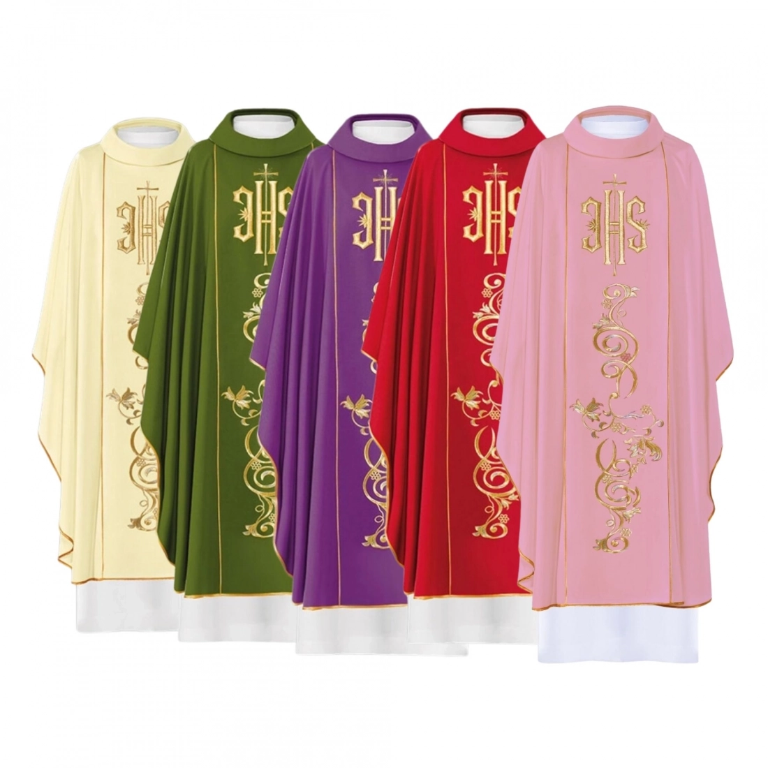 Casula sacerdotale realizzata in tessuto misto poliestere e lana, con fascione centrale ricamato con Simbolo Mariano in filo dorato e argentato e motivo floreale che si sviluppa sotto il trigramma. Sul retro si ripete il ricamo dell'ornato su tutta la lunghezza dello stolone. Disponibile nei 4 colori liturgici, più il rosa (che viene utilizzato nella terza domenica di Avvento e la quarta domenica di Quaresima). Prodotta in Polonia, da un'azienda di artigiani.