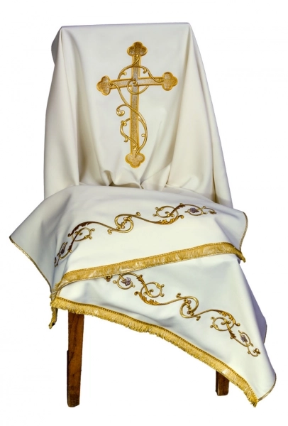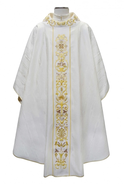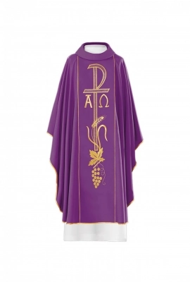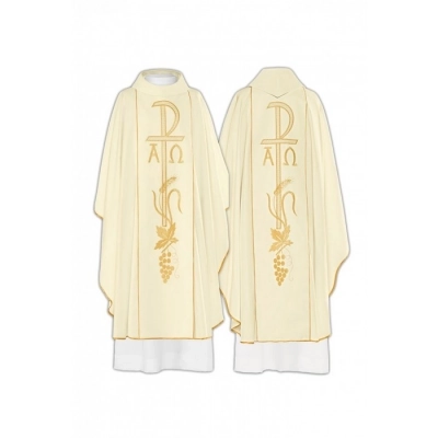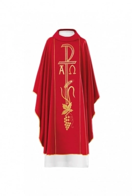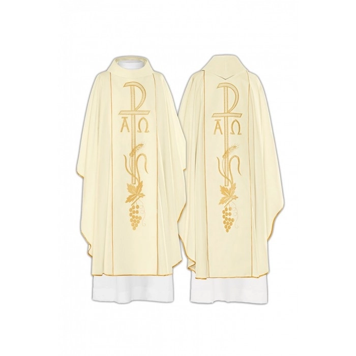 Casula sacerdotale realizzata in tessuto misto poliestere e lana, con ricamo Simbolo Pax, Alfa e Omega, posizionato centralmente in alto e con ricamo spighe e grappolo d'uva che scende verso il basso su tutta la lunghezza del tessuto. Disponibile nelle varianti avorio e rosso. Prodotta in Polonia, da un'azienda di artigiani.