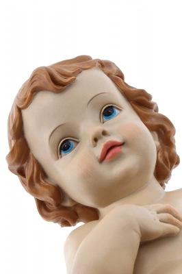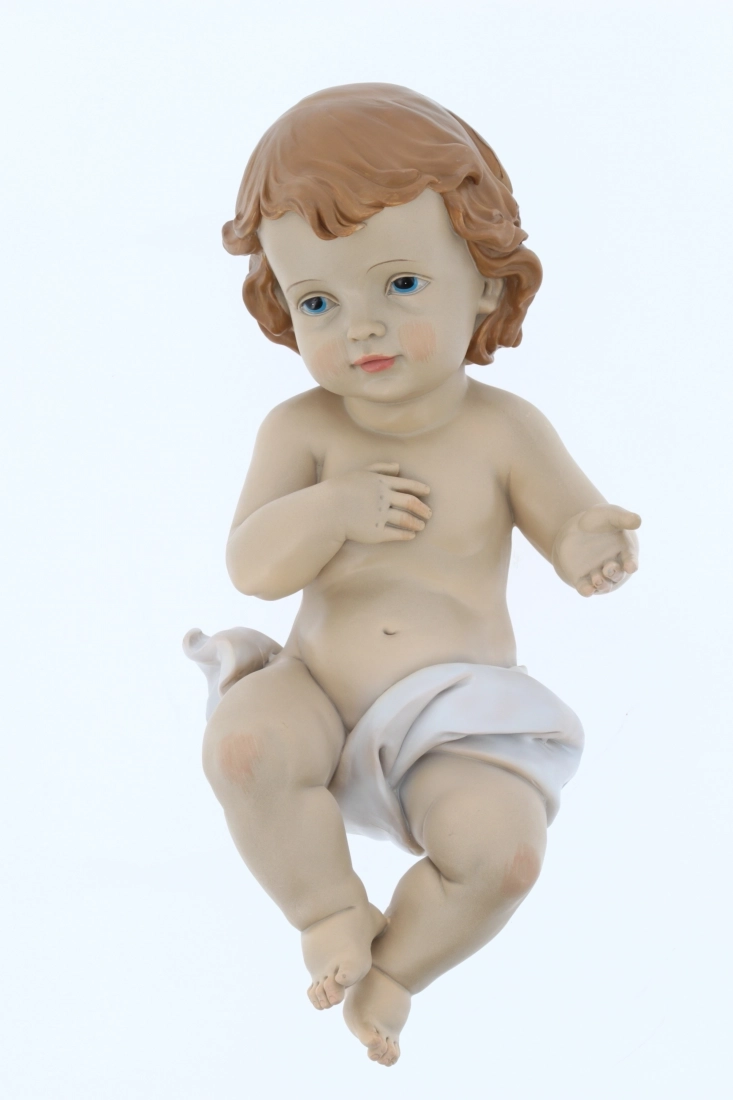 Statua di Gesù Bambino in resina dipinta, dall'altezza di 33 cm. Il bambinello è raffigurato con una mano sinistra sul petto e l'altra con la mano aperta. Date le dimensioni si rende adatto per essere collocato nei presepi grandi, posti per esempio dentro le Chiese nel periodo natalizio oppure può essere esposto anche in qualsiasi ambiente domestico.