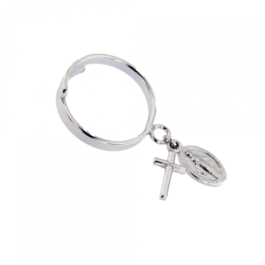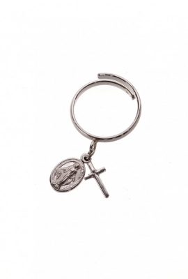 Elegante anello in argento 925, con due ciondolini entrambi delle dimensioni di 1x0,7 cm. Un ciondolo è la medaglia miracolosa e l'altro è invece è una croce. Essendo regolabile, è adattabile ad ogni tipologia di dito.