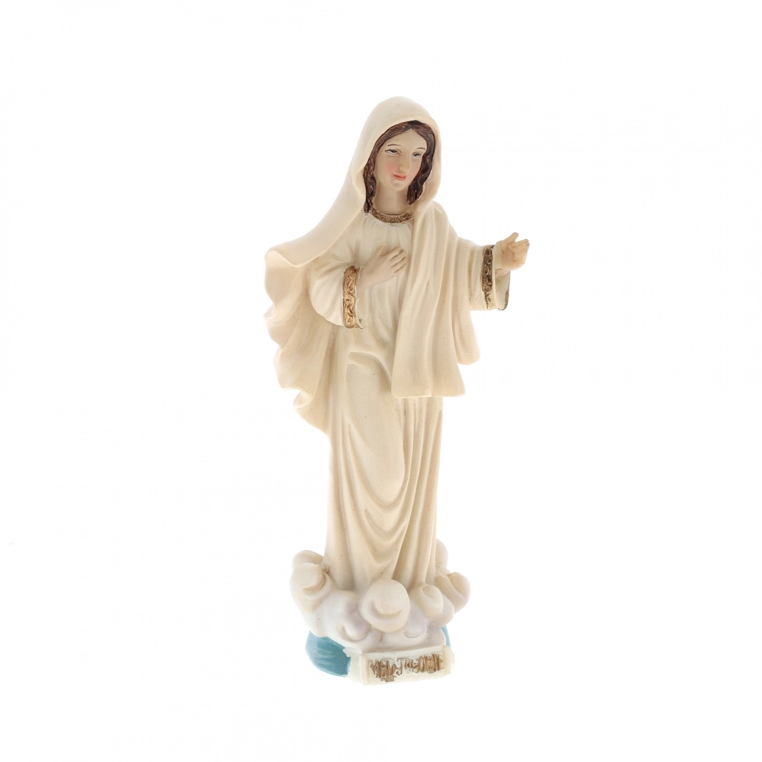 Statua, dall'altezza di 12,5 cm, realizzata in resina e dipinta a mano, rappresenta la Regina della Pace di Medjugorje, nella stessa posizione, con gli stessi vestiti e posta su una nuvola, proprio così come i veggenti la descrivono.