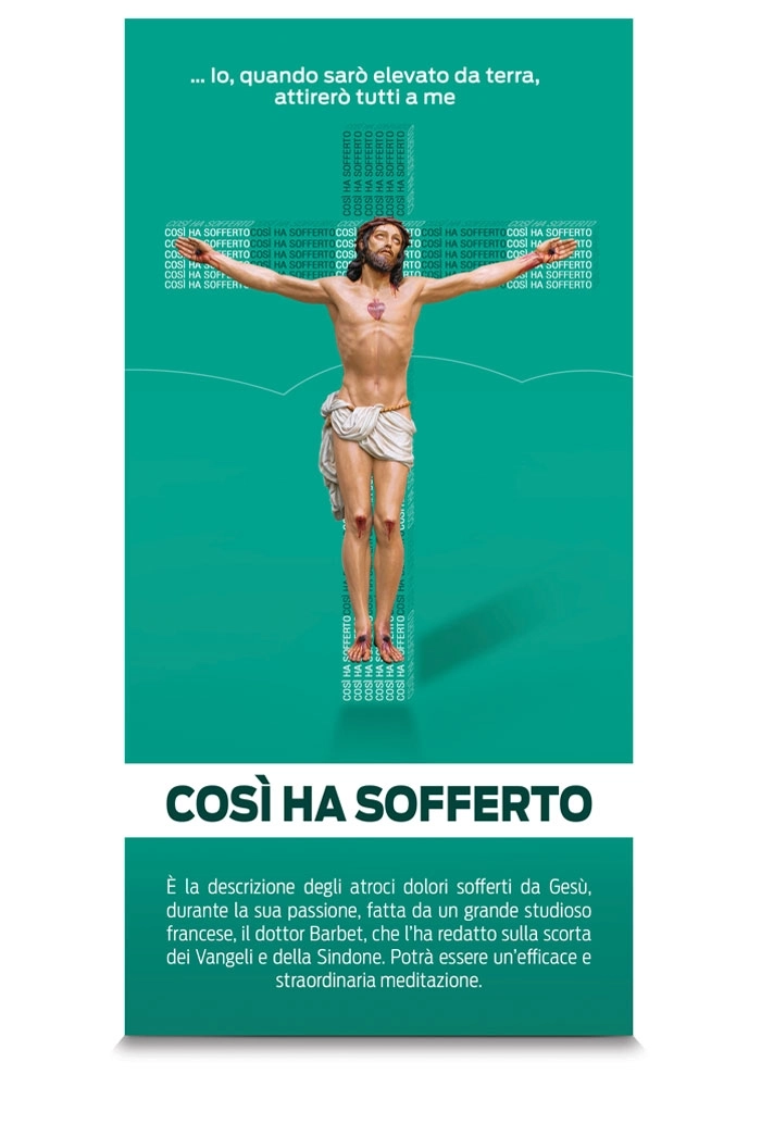 Il pieghevole contiene la descrizione degli atroci dolori sofferti da Gesù durante la sua passione. L'autore, il dottor Pierre Barbet, chirurgo francese e grande studioso, ha sviluppato la narrazione della passione e morte del Signore a partire dai Vangeli e dalla Sindone, integrandola con le sue conoscenze mediche, fisiologiche, anatomiche e archeologiche. Non si può leggere la passione di Cristo con le spiegazioni delle sofferenze corporali, senza provare una intensa emozione.