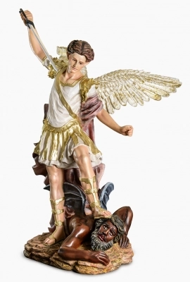 Bellissima statua di San Michele della dimensione di 120 cm, realizzata in resina. San Michele è rappresentato mentre scaccia il demonio, con la spada puntata verso di lui. L’Arcangelo è raffigurato con una veste bianca e oro, un mantello rosso e dei calzari dorati; la base su cui poggia imita la nuda roccia. Tutta la scultura è dipinta a mano da sapienti artigiani portoghesi. La statua è ideale come arredo di interni.