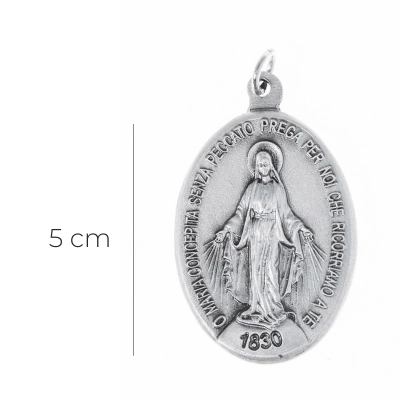 Bellissima medaglia Miracolosa in ottone, dall'altezza di 5 cm, riprodotta fedelmente come l'originale, così come apparsa alla veggente Santa Caterina de Labourè nel 1830 a Rue de Bac. La scritta nella parte frontale è in lingua italiana e riporta la seguente frase "O Maria concepita senza peccato prega per noi che ricorriamo a te". La medaglia è dotata di anellino per poter essere appesa ad una catenina ed indossata al collo (catenina non inclusa). La medaglia è estremamente dettagliata e rifinita con cura. Realizzata appositamente per Editrice Shalom, che ne ha seguito direttamente tutta la lavorazione, dalla scultura in plastilina fino alla realizzazione del primo modello. Rigorosamente ideata e prodotto in Italia da un'azienda artigianale e leader nella produzione di medaglie.