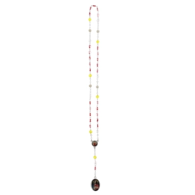 La corona è composta da 5 poste di 7 grani in vetro trasparente con anima rossa o bianca e da un grano giallo di diametro 6 mm. La crociera raffigura lo Spirito Santo. Sulla medaglia finale è raffigurato Gesù Misericordioso.