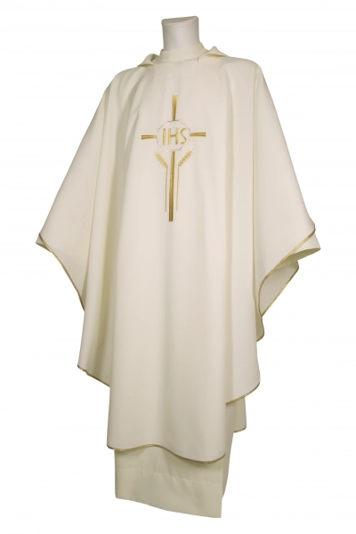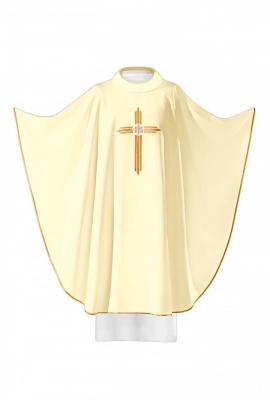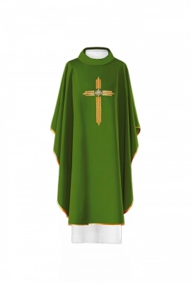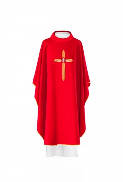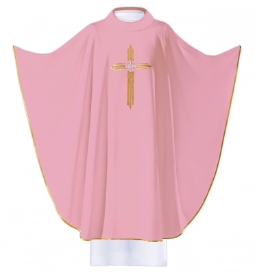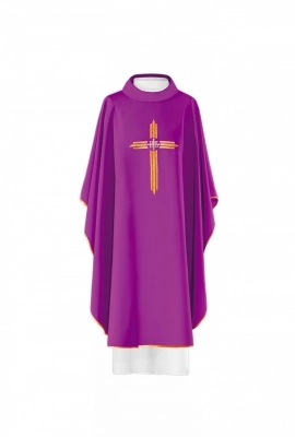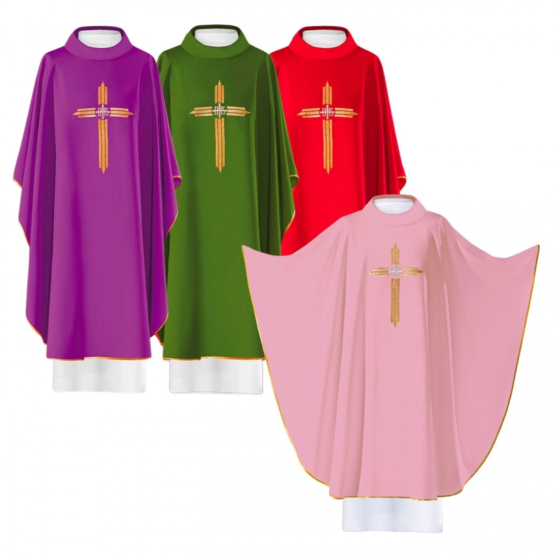 Casula in tessuto poliestere. Adatta per un uso quotidiano. Sul danti presenta una croce ricamata in oro ed è disponibile nei 4 colori liturgici più il rosa (che viene utilizzato nella terza domenica di Avvento e la quarta domenica di Quaresima).