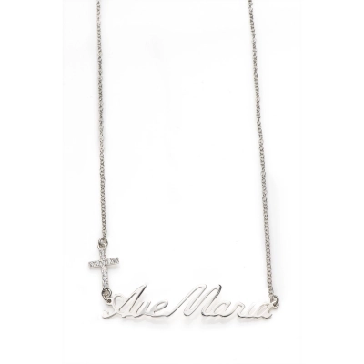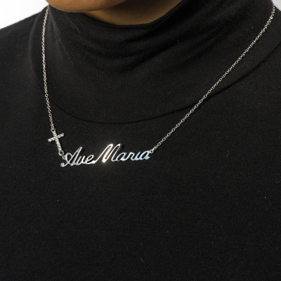 Elegante collana in argento 925 con al centro la scritta Ave Maria (delle dimensioni di 5x1,5 cm) e una piccola croce di zirconi (delle dimensioni di 1,5x1 cm). La collana è dotata di moschettone per la chiusura e misura 42+ 3 cm di allungo. Bellissimo ed evocativo pensiero da regalare: l'origine dell'Ave Maria infatti si radica nel saluto angelico, un momento di annuncio divino che segna la storia della salvezza. "Ave Maria" non è un semplice saluto, ma un rimando al potente messaggio dell'Arcangelo Gabriele a Maria, che apre con un invito alla gioia, simbolo della fecondità e della grazia divina.