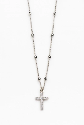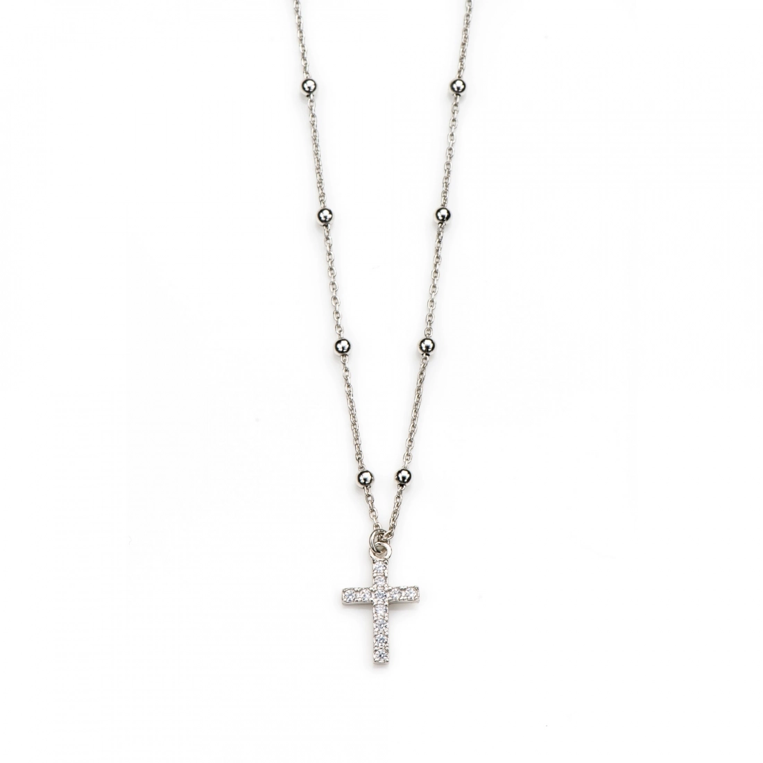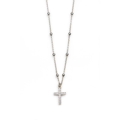 Elegante collana in argento 925 con al centro una piccola croce di zirconi (delle dimensioni di 1,5x1 cm). La collana, in maglia pallinata, è dotata di moschettone per la chiusura e misura 42+ 3 cm di allungo, circonferenza 90 cm.