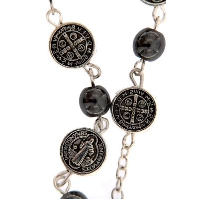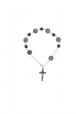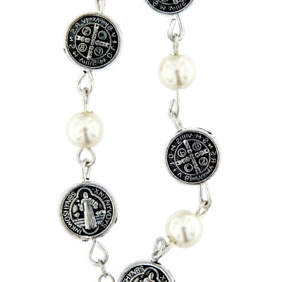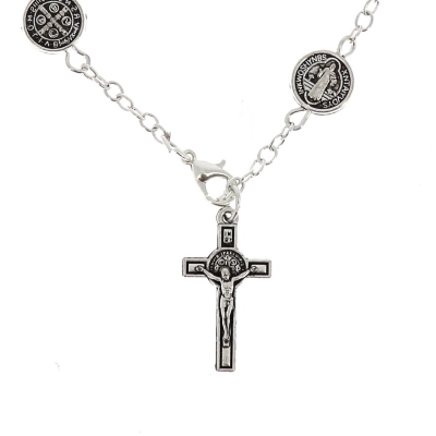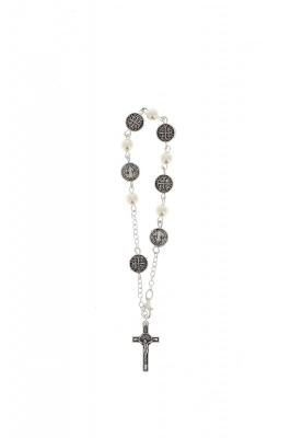 Decina in metallo con medaglie di san Benedetto da 1 cm di diametro, intervallate da grani in vetro perlato bianco oppure in ematite di diametro 6 mm. Piccola, pratica e comoda, può essere sempre portata con sé. È anche una bellissima idea regalo pensata per chi è molto devoto o per avvicinare alla figura di san Benedetto. La decina è dotata di un moschettone che ne consente l'apertura e la chiusura, così da poterla indossare al polso o appendere ovunque si vuole, anche in macchina.