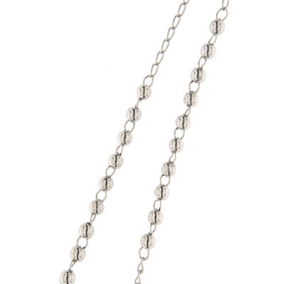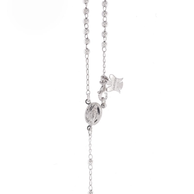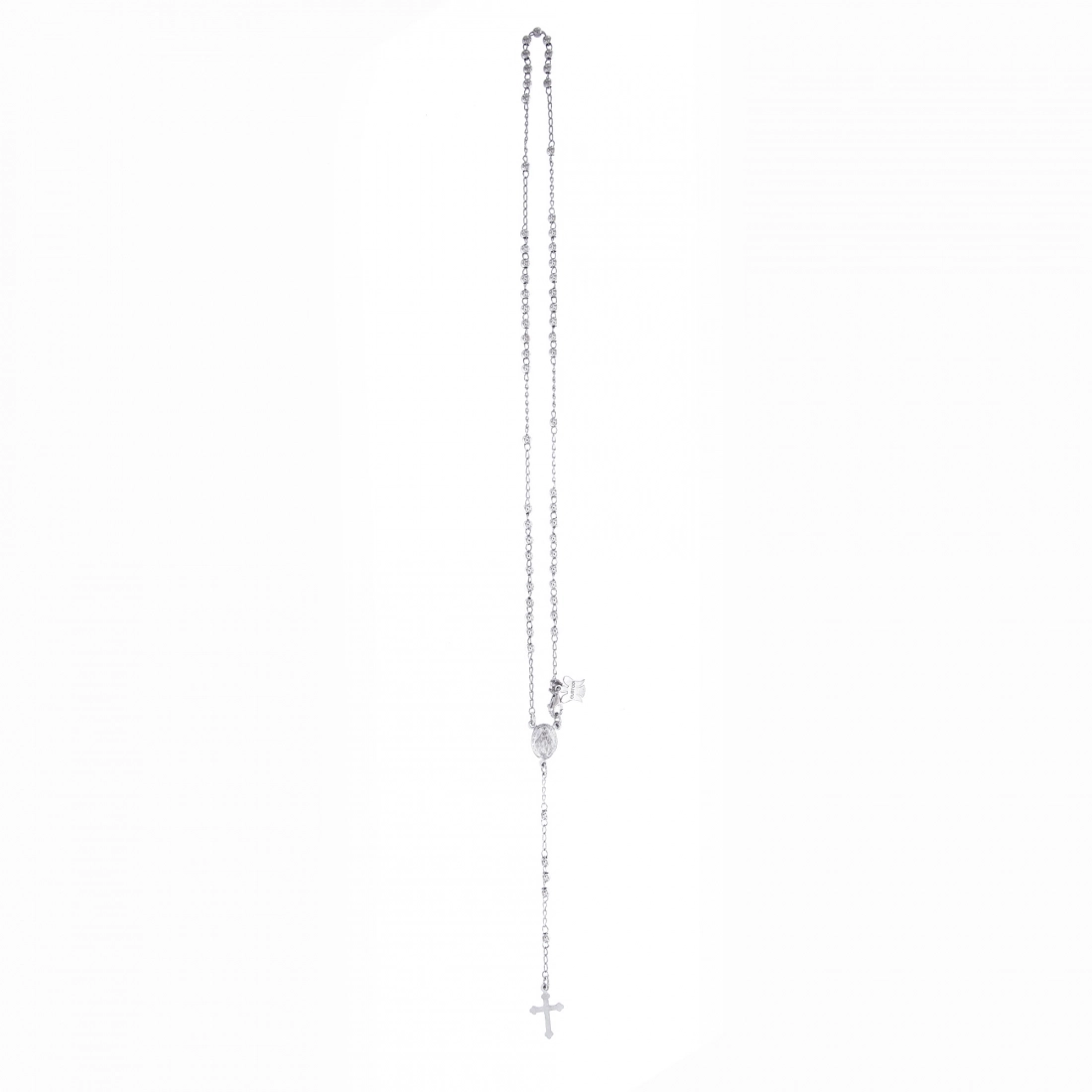 Collana Rosario in argento 925, della lunghezza di 33,5 cm e circonferenza di 48 cm. La croce misura 2x1 cm e la crociera raffigurante la medaglia miracolosa è di 1x0,5 cm. Il grano è di 0,2 cm. Questa collana è dotata di moschettone che la rende adatta ad essere indossata ed è disponibile in argento rodiato.