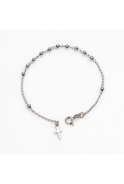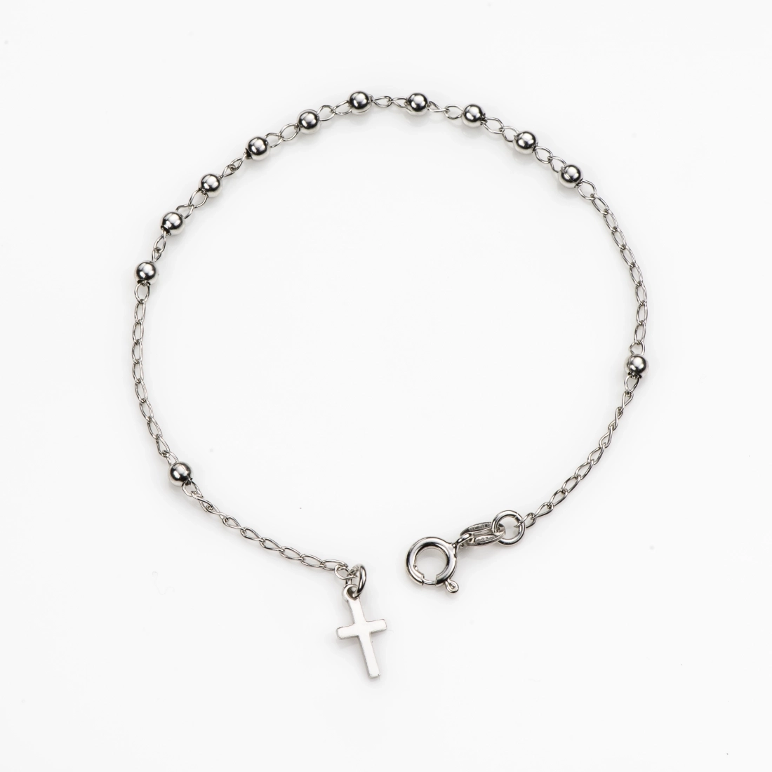 Bracciale in argento 925 rodiato, dalla lunghezza di 17 cm, realizzato con una catena sottile e 10 perline in argento, dal diametro di 3 mm, che rappresentano una decina del Rosario. Alla fine del bracciale è stato inserito un piccolo pendente a croce dall'altezza di 1 cm. Realizzato in Italia per Editrice Shalom, da artigiani orafi esperti.