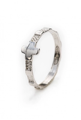 Semplice ed elegante anello decina del rosario, utilissimo strumento per pregare il rosario. E' caratterizzato da dieci piccoli rilievi per aiutare a tenere traccia delle preghiere, al centro una croce di 0,5x0,5 cm. Realizzato in argento 925 rodiato e disponibile in tutte le misure. Realizzato in Italia da azienda artigianale specializzata nella lavorazione dell'argento. Segui la tabella qui sotto e scegli la misura giusta per te!
