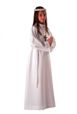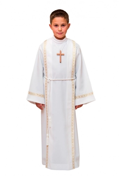 Veste per Prima Comunione, adatta per maschi e femmine, realizzata in 100% poliestere, di colore bianco a tinta unita senza alcun decoro. La tunica è semplice, ha un taglio svasato con il collo rivoltato. L'abito è disponibile in varie misure standard con la possibilità di avere delle misure personalizzate, consultare la tabella e lo schema presente tra le foto del prodotto. Realizzata e confezionata interamente in Italia.