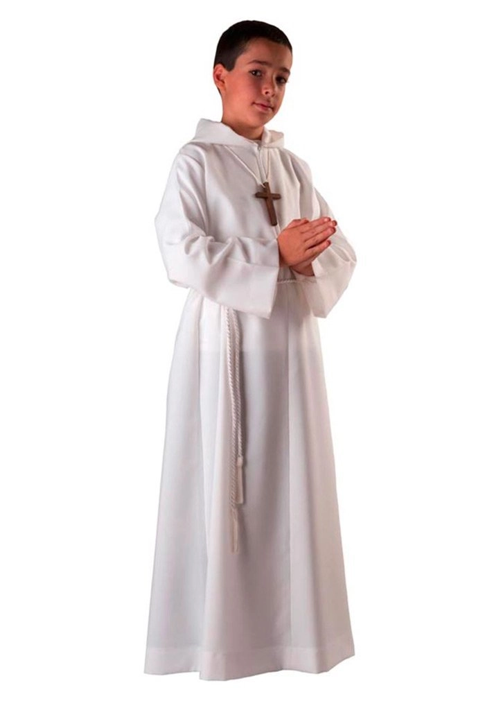 Veste per Prima Comunione, adatta per maschi e femmine, realizzata in 100% poliestere, di colore bianco a tinta unita senza alcun decoro. La tunica è semplice, taglio svasato con cappuccio. L'abito è disponibile in varie misure standard con la possibilità di avere delle misure personalizzate, consultare la tabella e lo schema presente tra le foto del prodotto. Realizzata e confezionata interamente in Italia.