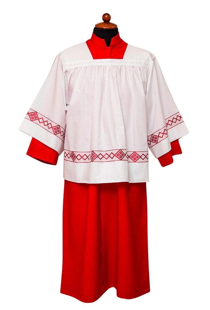 Veste per Chierichetti, adatta per maschi e femmine, realizzata in 100% poliestere, di colore rosso a tinta unita completa di cotta in misto cotone con applicato un bordino rosso decorato. Realizzata e confezionata interamente in Italia. Non è possibile realizzare misure personalizzate.